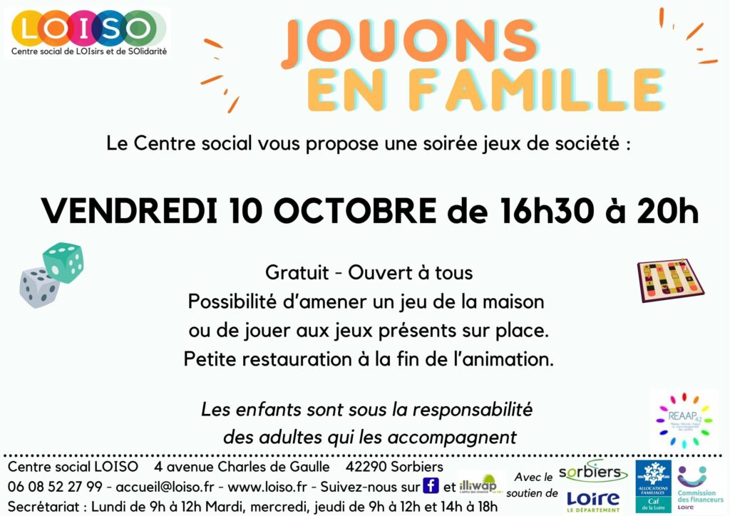 SOIRÉE JEUX Famille Loiso Animations collectives 7 octobre 20256 octobre 2025 Vendredi après l’école, venez jouer en famille au Centre social LOISO ! De 16h30 à 20h pour passer un moment convivial.Gratuit et ouvert à tous (Enfants accompagnés d’un adulte)