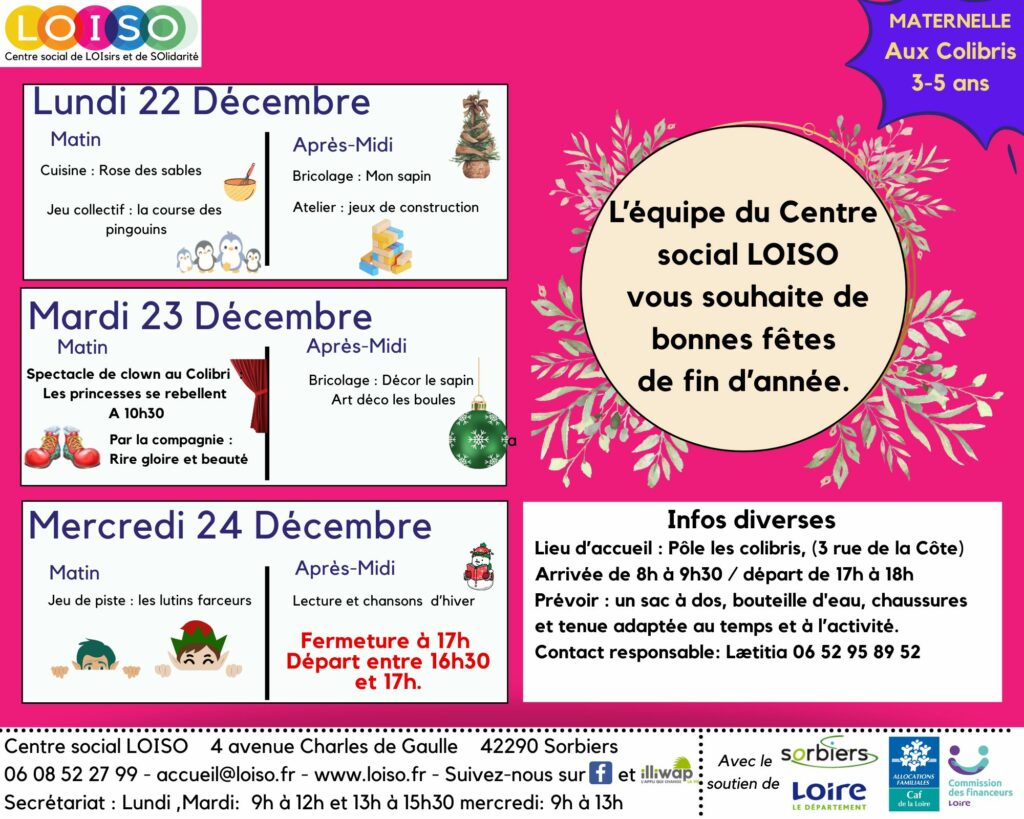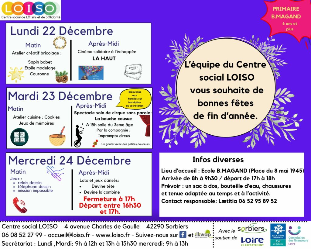 Les 2 propositions sont indépendantes, gratuites et sur inscription au Centre social LOISO ou par téléphone au secrétariat : 06 08 52 27 99.